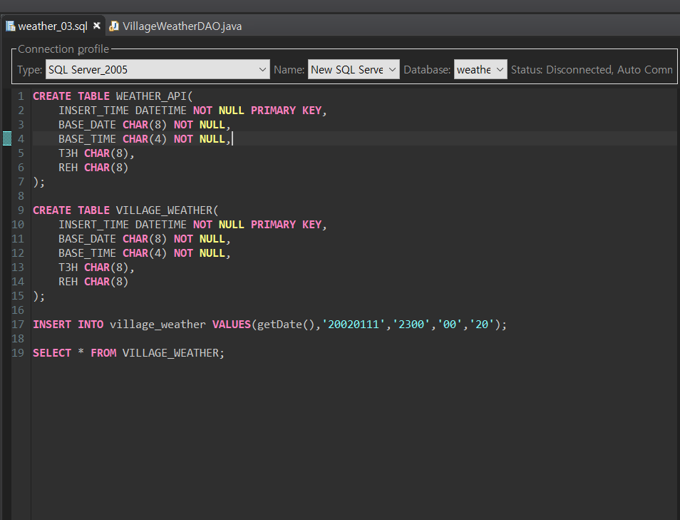 INSERT INTO village_weather VALUES(getDate(),'20020111','2300','00','20');