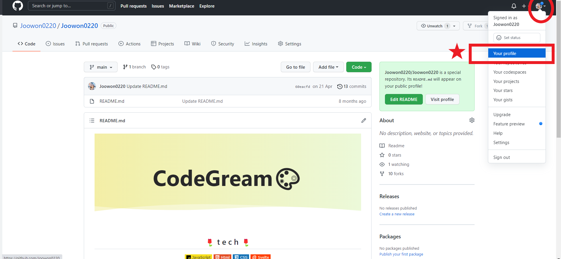 1. ์ฐ์ ๊นํ๋ธ ์๋จ ์ค๋ฅธ์ชฝ์ ์๋ ๋ณธ์ธ ํ๋กํ ๋งํฌ ํด๋ฆญ > Your profile๋ก ๋ค์ด๊ฐ๋๋ค.