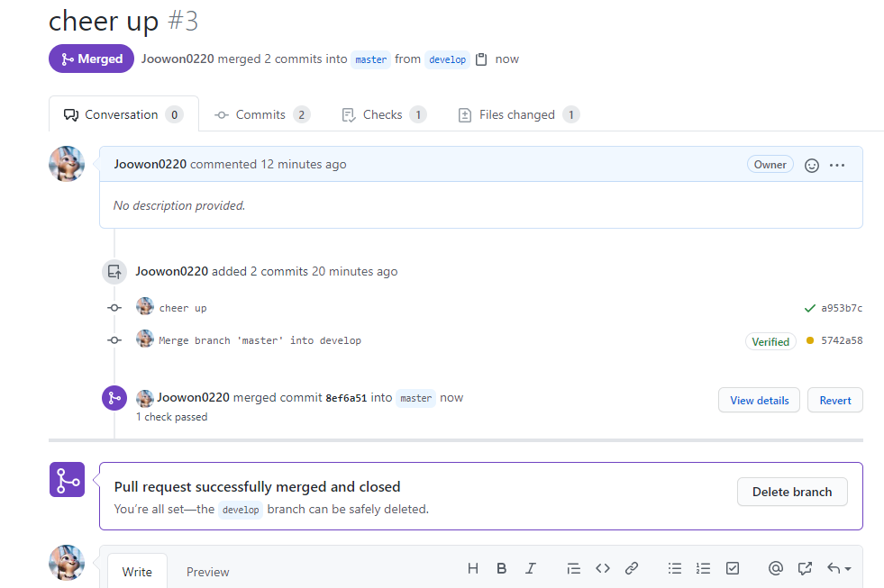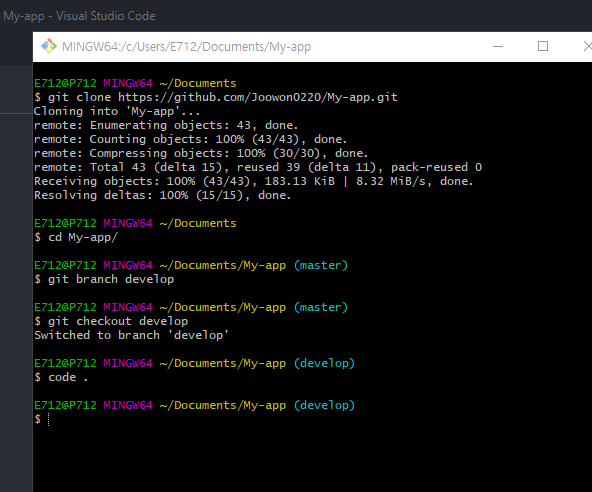 ---> ์๋ก ๊ฐ์ง์น๊ธฐ ํ ๋ธ๋์น ์ด๋ฆ์ ๋ง๋ค์ด์ ์ ๋ ฅํด ์ฃผ์ธ์.