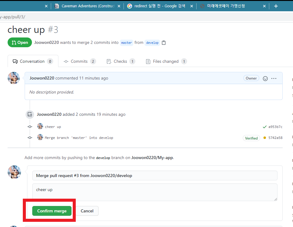 confirm merge๊น์ง ๋๋๋ฉด ์ฝ๋ ํฉ์ณ์ง๊ธฐ ๋.