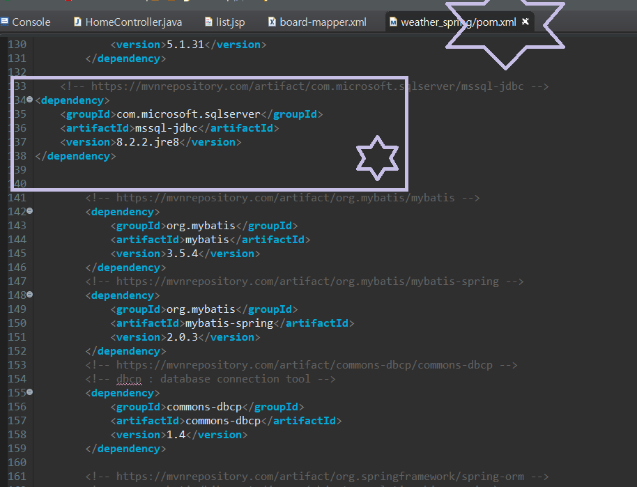 - pom.xml์ ๋ด๊ฐ ๋ฐ์ mssql-jdbc์ ๊ฐ์ ๋ฒ์ ์ jre๋ฅผ dependency๋ฅผ ๋ฃ์ด์ค๋๋ค.