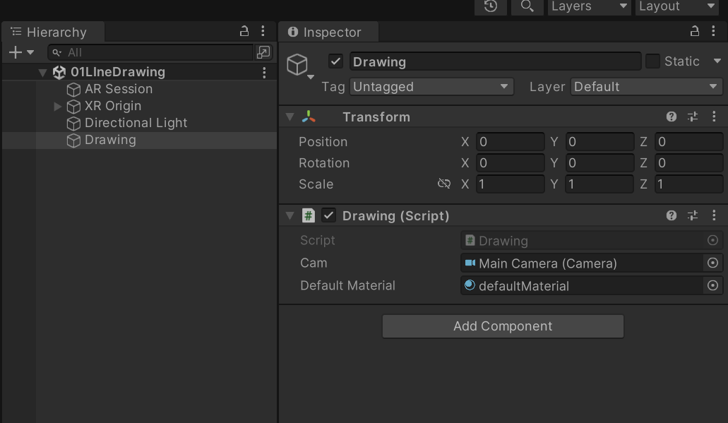 Asset์ ์๋ Drawing script ํ์ผ์ hierarchy์ ๋๋๊ทธ ์ค ๋๋กญ ํด์ฃผ์ธ์.