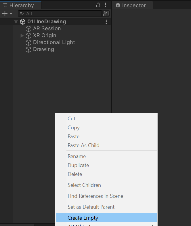 4-1. ์ ๋ํฐ hierarchy์์ ๋ง์ฐ์ค ์ค๋ฅธ์ชฝ ํด๋ฆญ -> Create Empty