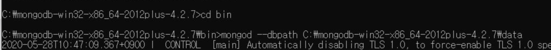 4. ๋ช ๋ ์ด mongod --dbpath ๋ชฝ๊ณ db๋ฐ์ดํํด๋ ๊ฒฝ๋ก (๋ช ๋ น์ด: mongod --dbpath C:\mongodb\data)