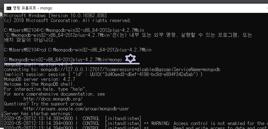 7. cd ๋ช ๋ น์ด๋ฅผ ์ด์ฉํ์ฌ mongoDB ํ์ bin ํด๋๋ก ์ด๋ํด์ฃผ์๊ณ mongo๋ฅผ ์ ๋ ฅํด์ฃผ์ธ์.