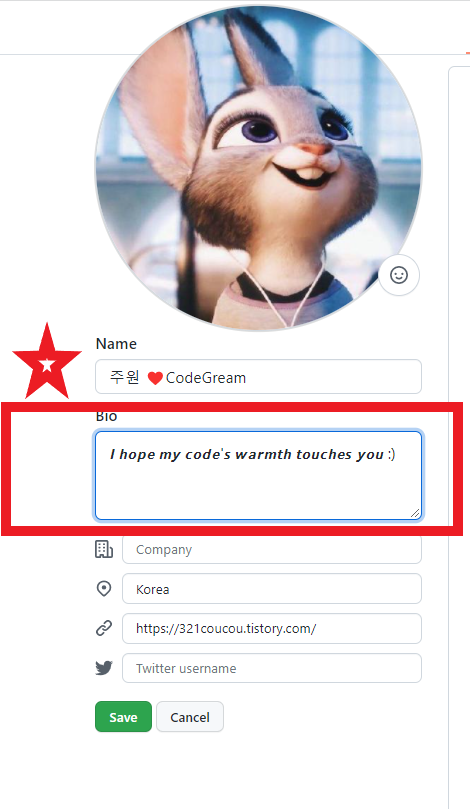3. Bio ํ ์คํธ๋ฐ์ค ์์ ๋ด์ฉ์ ๋ฐ๊ฟ์ค๋๋ค.