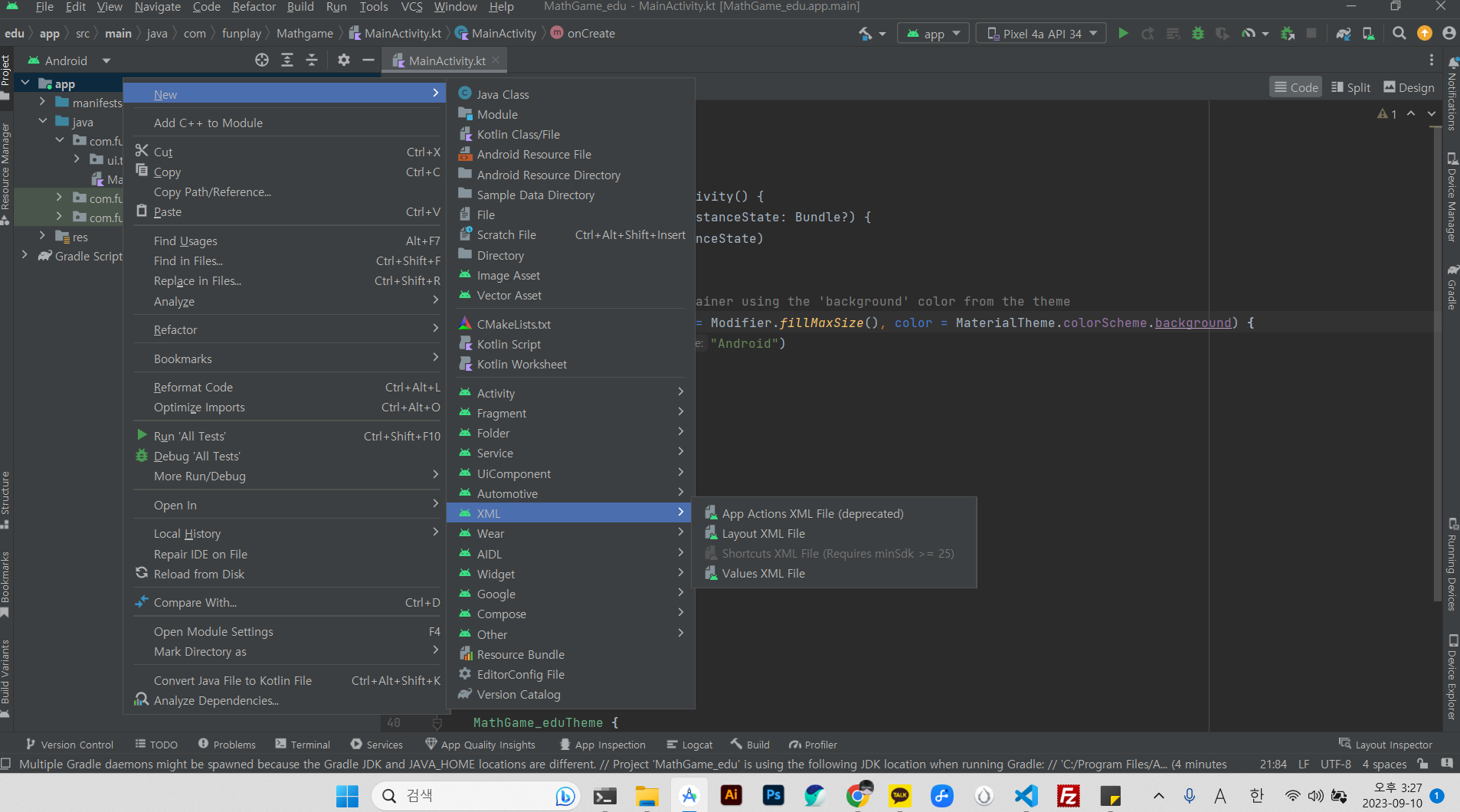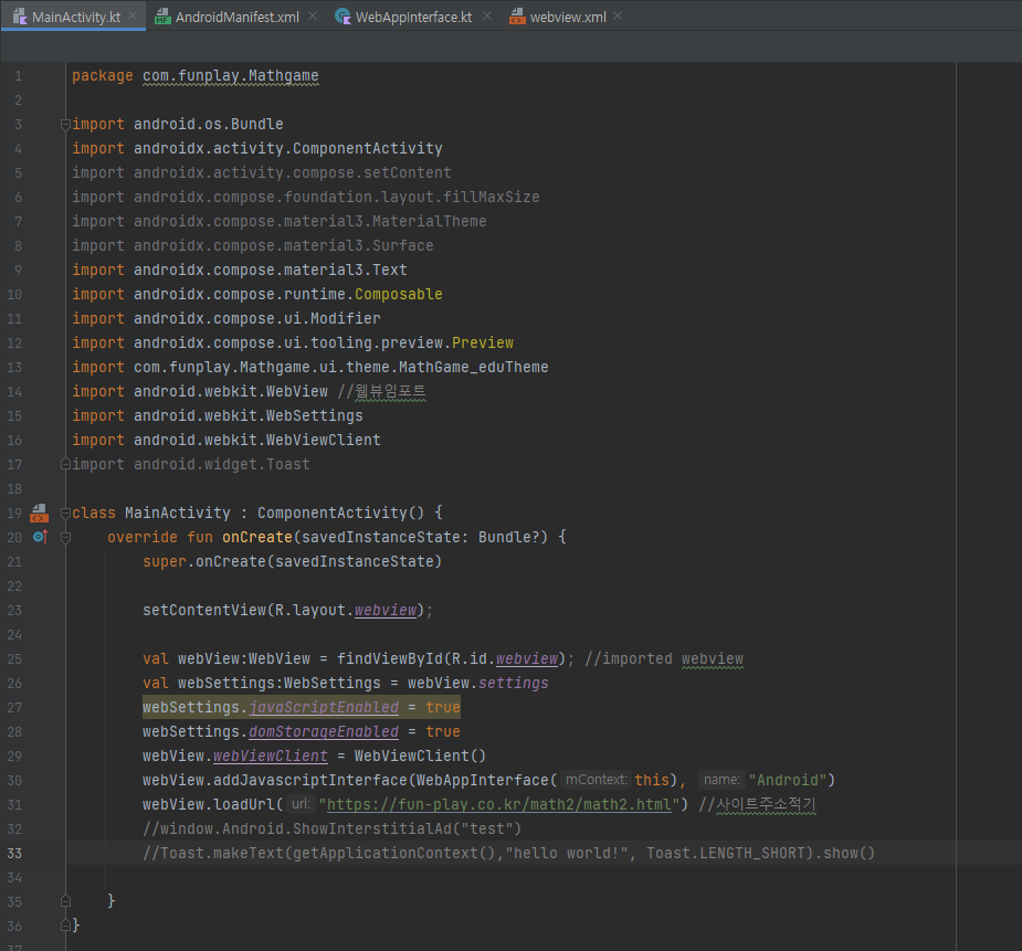๋ค์์ MainActivity.kt ํ์ผ์ ์๋์ ๊ฐ์ด ์ค์ ํด ์ฃผ์ธ์.